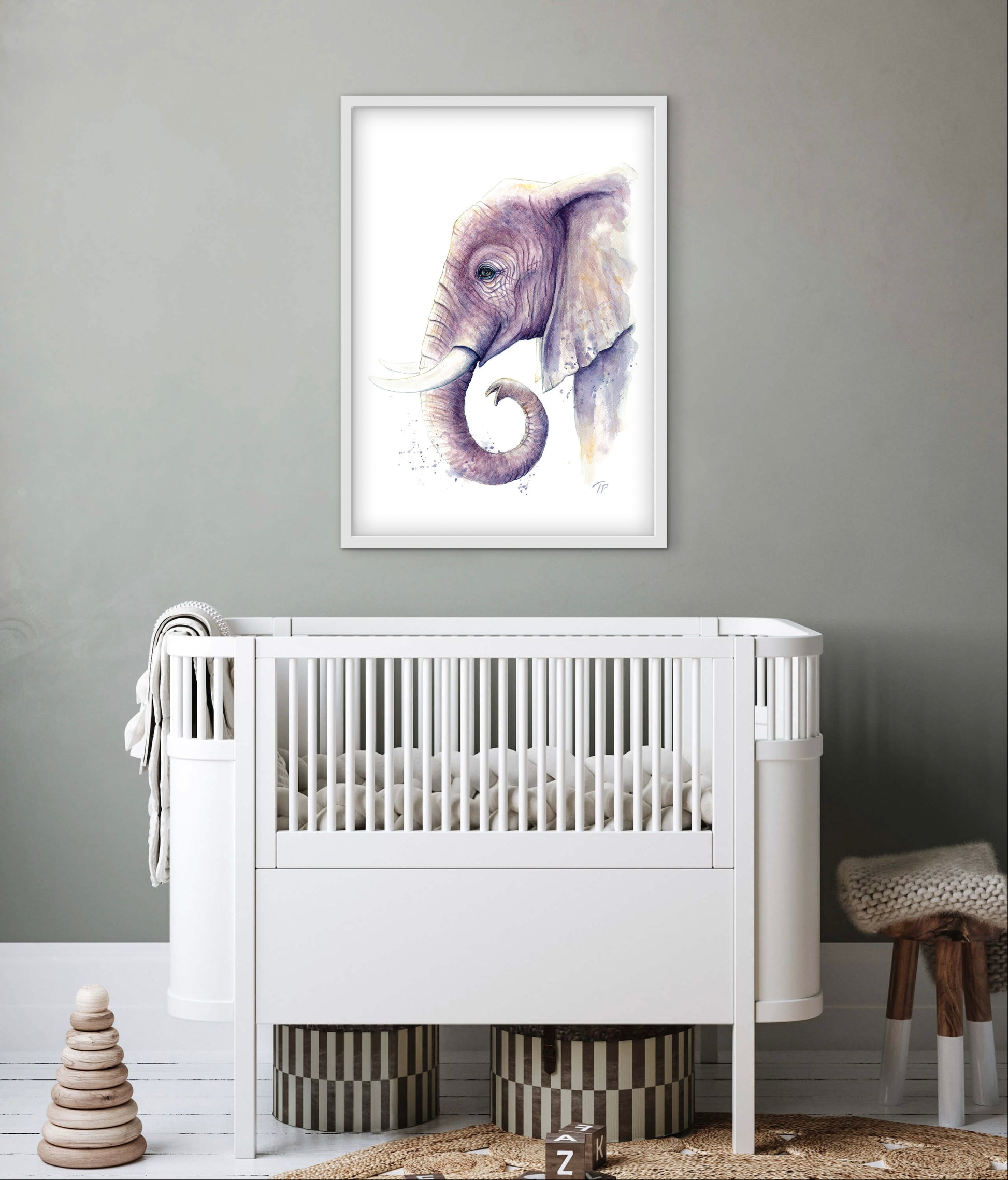 This calm and thoughtful elephant portrait, painted with a balanced blend of soft greys, warm purples, and gentle touches of orange light, embodies quiet strength and grace. The fluid watercolor tones merge seamlessly across the white background, enhancing the elephant’s peaceful presence and natural beauty. Perfect for adding warmth, serenity, and a sense of gentle wonder to any room.